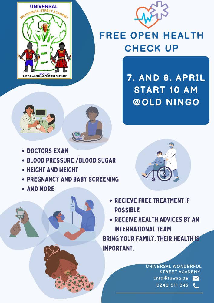 Wow! Was für ein Erfolg beim jährlichen Health-Check-Up! Dank der Hilfe vieler freiwilliger medizinischer Experten und engagierten Hilfskräften konnten an der UWSA in Old Ningo und Jamestown über insgesamt sechs Tage bis zu 10.000 Menschen mit kostenloser medizinischer Behandlung und Hilfsgütern geholfen werden. Ob eine neue Brille, wichtige Medikamente, Rollstühle, medizinischer Rat oder einfach nur die Vergewisserung beim Arzt, ob auch wirklich alles in Ordnung ist – all das ist für uns in Deutschland selbstverständlich, aber verändert das Leben für viele Leute in Ghana! Und genau deshalb haben Sir Louis und seine Helfer über Monate gezielt Freiwillige und Spenden akquiriert und Werbung in den Communities gemacht, damit so viele Leute hiervon profitieren konnten, wie nur irgendwie möglich. Nachdem zunächst die aktuellen Schüler versorgt wurden, durften auch jeder Anwohner der Schulgebiete kommen und sich kostenlos helfen lassen. Hierfür wurde angesichts des riesigen Andrangs teilweise bis in die Dunkelheit hinein mit Taschenlampen gearbeitet. Vielen Dank an alle, die dies möglich gemacht haben! So ein Angebot ist für die Leute im Hauptstadtviertel Jamestown schon toll, aber für Leute aus den ländlichen Gebieten wie Old Ningo eine Sensation!